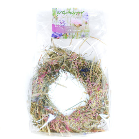 Wunderschöner Heukranz mit rosa Kornblumen und Hirse. Mit Naturband zum Befestigen.
