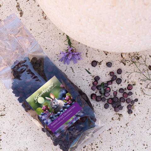 Der Spätsommer im Kaninchennapf! Gefriergetrocknete Heidelbeeren sind wahre Vitaminbomben und besitzen viele sekundäre Pflanzenstoffe, welche das Immunsystem effektiv stärken.